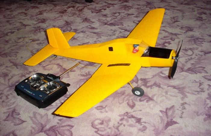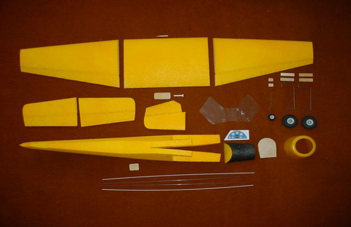 Zestaw RC co najmniej czterokanałowy, 4 mikroserwa 9 g, silnik bezszczotkowy o mocy 150–300 W, bezszczotkowy regulator prędkości 20–30 A, śmigło 9 × 5–6", stożek śmigła, akumulator LiPo 2S–3S o pojemności 1000–1500 mAh i odpowiednia ładowarka.