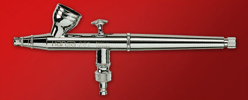 Pistolet natryskowy do zastosowań hobbystycznych i profesjonalnych. Chromowane wykończenie zapewnia większą odporność na ścieranie i agresywne rozpuszczalniki. Pistolet nadaje się szczególnie do prac precyzyjnych. Po doposażeniu w zestaw do regulacji 0,3 mm i większy pojemnik nadaje się również do pracy na większych powierzchniach. Podwójna funkcja zależna, samocentrująca dysza wtykowa 0,2 mm, pojemnik na farbę 2 ml. Regulacja ograniczenia farby, dopływ powietrza z szybkozłączką.