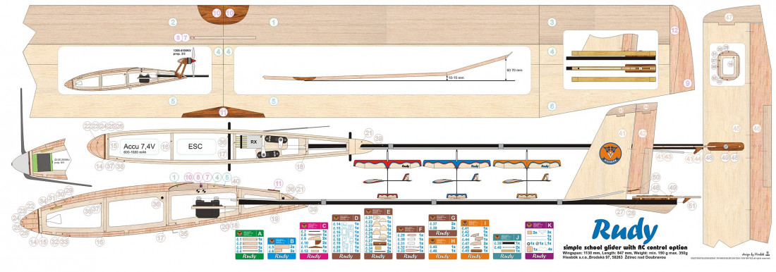 Rudy to zestaw prostego szkolnego szybowca RC. Może być jednak używany również jako model wolny (odpowiada kategorii A1/F1H). Można go wyposażyć w silnik elektryczny o rozmiarze 1306 ze śmigłem 3/3, aby uzyskać cichszy lot, lub silnik elektryczny o rozmiarze 2225 ze śmigłem 6/4, aby uzyskać bardziej energiczny lot. Model ma doskonały szybowanie i opadanie. Bardzo dobrze reaguje na prądy termiczne, można go również używać do lotów na stoku przy słabszym wietrze.