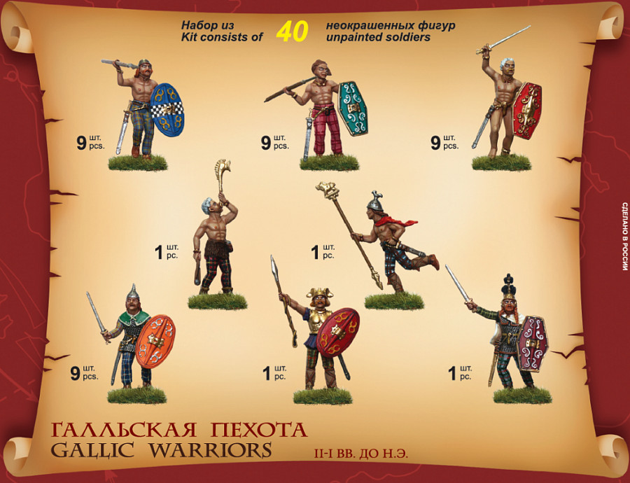 Zestaw plastikowych figurek wojowników galijskich w skali 1:72. Zestaw zawiera 40 niepomalowanych figurek z bronią i wyposażeniem.