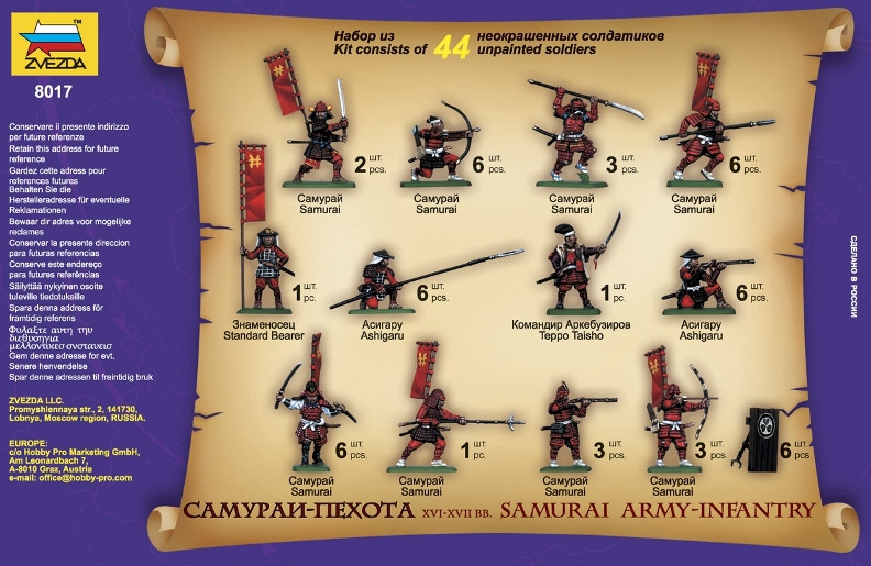 Zestaw plastikowych figurek wojowników samurajów w skali 1:72. Zestaw zawiera 44 niepomalowane figurki w różnych pozycjach, wraz z bronią i wyposażeniem.