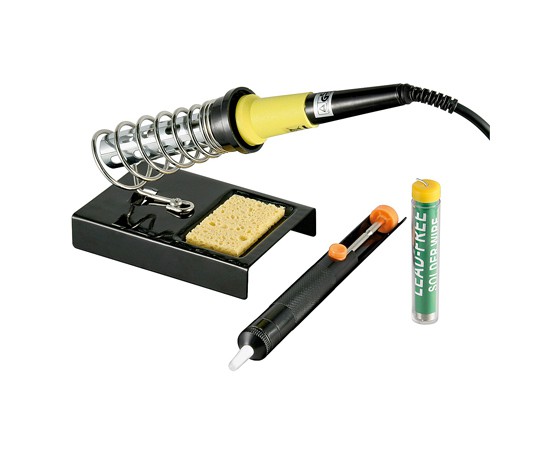 Wysokiej jakości ręczna lutownica do ogólnego stosowania. W zestawie znajduje się lutownica o mocy 30 W, podstawka, pojemnik na cynę, gąbka do czyszczenia grotów lutowniczych oraz bezołowiowa cyna. Zasilanie sieciowe 230 V/50 Hz.