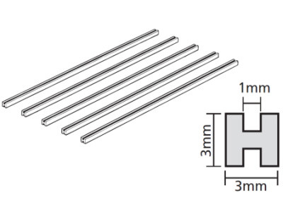 Belki plastikowe Tamiya – plastikowy profil H 3 mm, długość 400 mm (5 szt.). Jest to profil z tworzywa sztucznego w kształcie litery H, który można stosować np. do łączenia płyt z tworzywa sztucznego o grubości 1 mm. Szerokość rowka wynosi 1 mm, przekrój poprzeczny wynosi 3×3 mm, długość profilu wynosi 400 mm. Profil można wykorzystać do tworzenia dioram, prac projektowych itp.