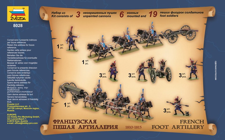Zestaw plastikowych figurek w skali 1:72 przedstawiających francuskich artylerzystów z lat 1810–1815. Zestaw zawiera plastikowe foremki do zbudowania 19 piechurów, 3 dział, 2 zaprzęgów sześciokonnych i innych akcesoriów.