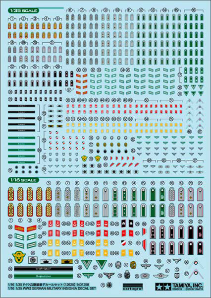 Zestaw naklejek z insygniami, które można szeroko stosować do uzupełniania figurek armii niemieckiej w skali 1:35 i 1:16. W zestawie znajdują się czołgiści, piechota, artylerzyści, piloci, oficerowie lub generałowie. Oprócz insygniów umieszczanych na kołnierzach i ramionach przygotowaliśmy szeroką gamę emblematów na mundury i czapki.