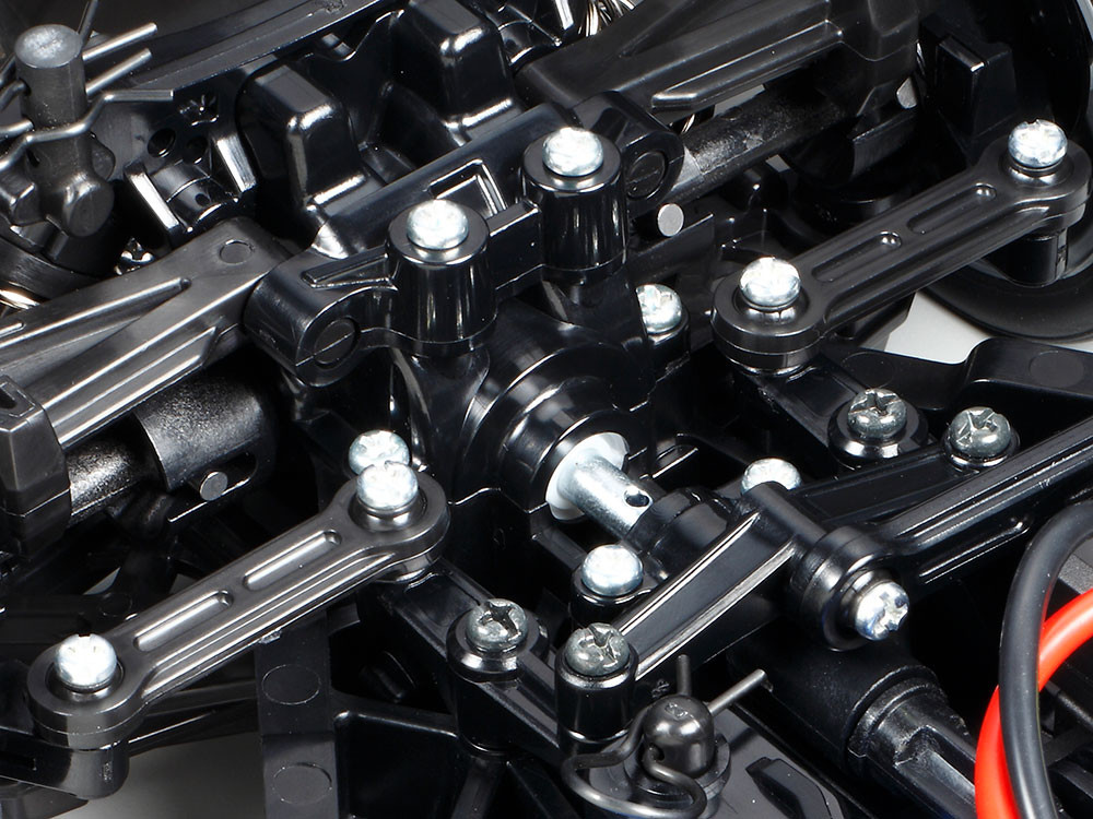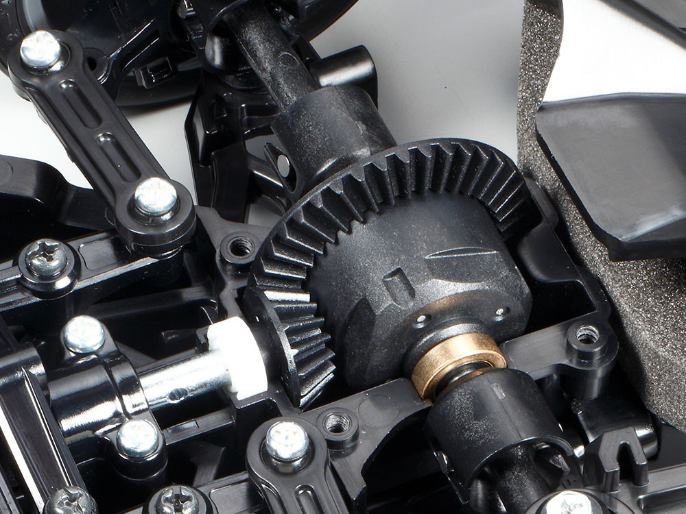 Podwozie TT-02 ma jednostkę napędową po prawej stronie, a akumulator napędowy po lewej. Takie rozwiązanie jest korzystne dla optymalnego wyważenia modelu. Ponadto podwozie zaprojektowano tak, aby jego konserwacja była jak najłatwiejsza, dzięki czemu poszczególne elementy są łatwo dostępne. Ci, którzy lubią eksperymentować, będą zachwyceni zmiennością platformy TT-02. Można wypróbować 10 różnych przełożeń, 2 ustawienia prześwitu i 2 różne wartości rozstawu osi.