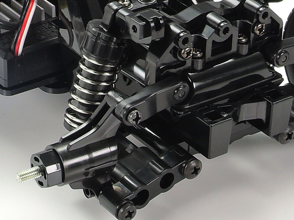 Podwozie M-05 jest wykonane z kompaktowego, lekkiego i wytrzymałego odlewu ze specjalnej żywicy. Przekładnie, jednostka napędowa, układ kierowniczy serwo, odbiornik i regulator prędkości są umieszczone w podwoziu z uwzględnieniem optymalnego rozkładu masy i uzyskania niskiego środka ciężkości. Podwójne niezależne zawieszenie wszystkich kół jest uzupełnione amortyzatorami ciernymi. Srebrne felgi aluminiowe są obute w gładkie opony wyścigowe.