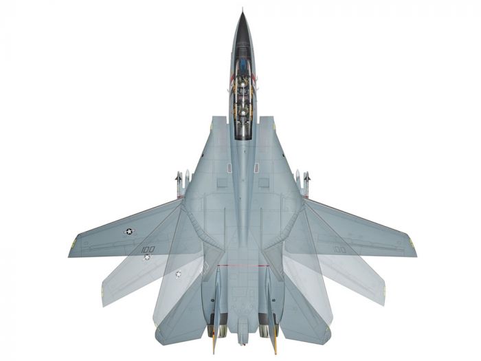 - Najwyższej jakości plastikowy model myśliwca Grumman F-14D Tomcat w skali 1:48;