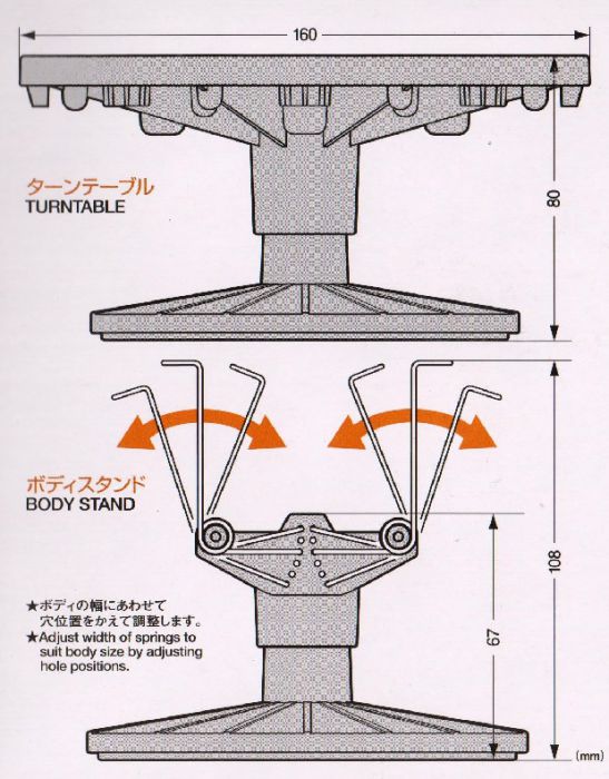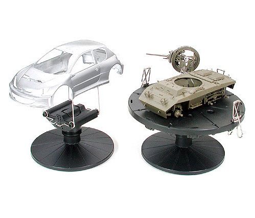 Ten dwuczęściowy, obrotowy i regulowany na wysokość stojak na farby jest idealnym pomocnikiem przy nakładaniu farby natryskowo. Stół o średnicy 16 cm wyposażony jest w praktyczne zaciski sprężynowe i otwory o różnych średnicach, które ułatwiają zamocowanie malowanej części. Szczególnie nadaje się do pewnego pozycjonowania i wygodnego ustawiania karoserii samochodów w skali 1:24. Oba stojaki wykorzystują prostą, obrotową podstawę. To narzędzie świetnie uzupełni zestaw do malowania natryskowego Tamiya Spray-Work Painting Tabletop Wall (dostępny tylko w niektórych krajach).