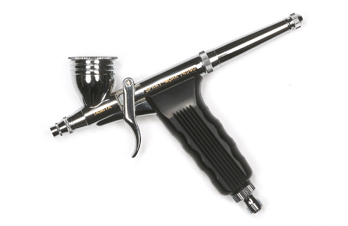 Wysokiej jakości aerograf dwustronnego działania firmy Tamiya z dyszą 0,3 mm i spustem pistoletowym.