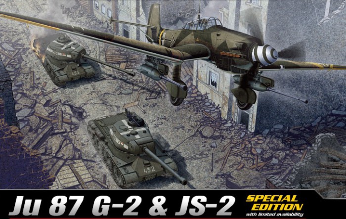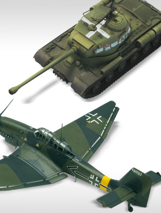 - Zestaw zawiera plastikowe formy niemieckiego bombowca nurkującego Ju 87G-2 i radzieckiego czołgu JS-2