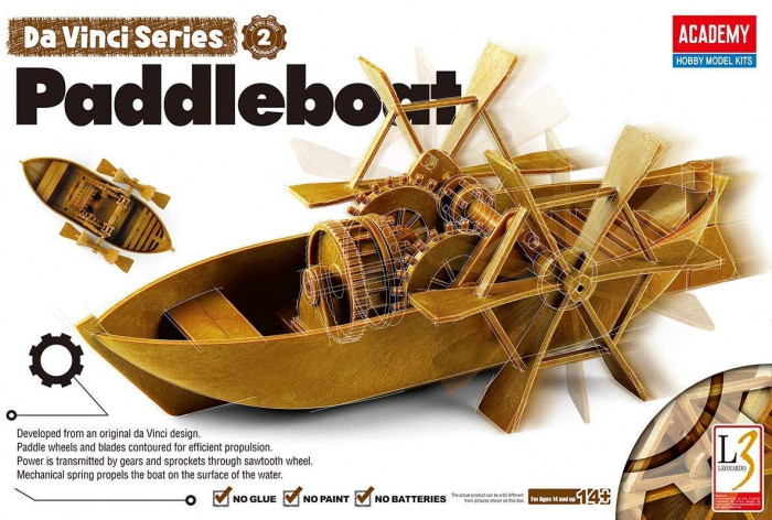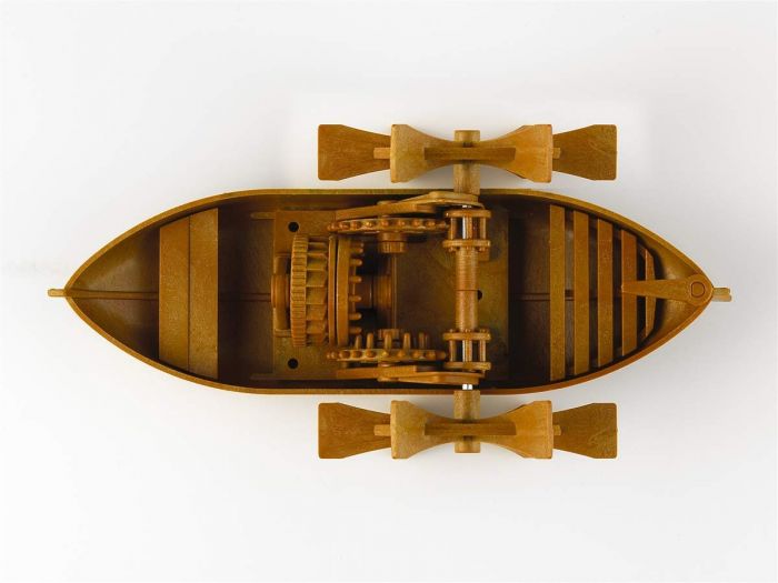 Plastikowy zestaw do budowy łodzi z działającym mechanizmem wiosła inspirowany projektami z epoki genialnego włoskiego rzeźbiarza, architekta, przyrodnika, muzyka, pisarza, wynalazcy i konstruktora Leonarda da Vinci. Do zbudowania modelu nie jest wymagany klej, farba ani specjalne narzędzia.