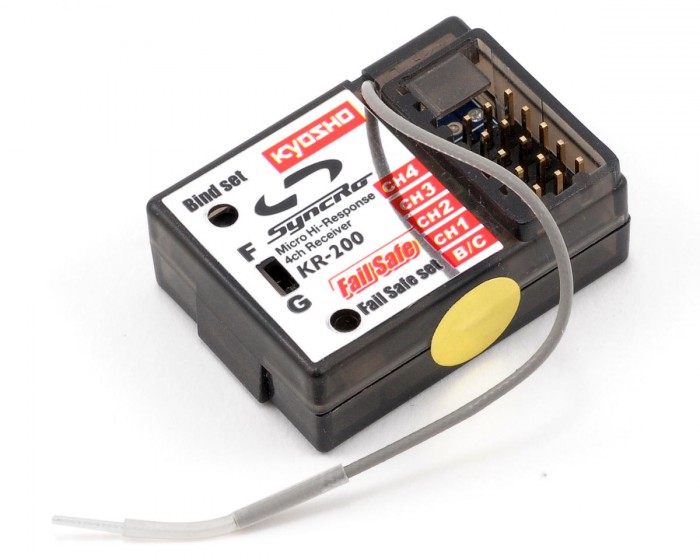Kompaktowy czterokanałowy odbiornik marki Kyosho wyposażono w funkcję bezpieczeństwa Fail Safe na wypadek nagłej utraty sygnału.