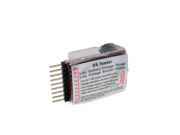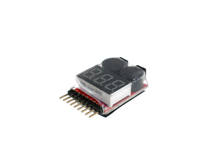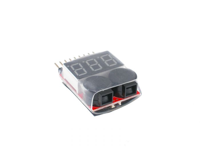 Cyfrowy woltomierz do akumulatorów LiPo, Li-ion, LiFe, LiMn Li-ion z 2–8 ogniwami połączonymi szeregowo. W przypadku pakietów 2-8 ogniw połączonych szeregowo można go także używać jako alarmu akustycznego ostrzegającego o niskim napięciu ogniwa (regulowany próg 2,0-3,8 V). Tester wyposażony jest w trzycyfrowy wyświetlacz LED, który pokazuje nie tylko całkowite napięcie zestawu, ale także napięcie poszczególnych ogniw. Całkowite napięcie można zmierzyć i wyświetlić w zakresie 4,0–15,0 V. Wystarczy podłączyć złącze serwisowe zestawu do woltomierza, a urządzenie zacznie działać natychmiast.