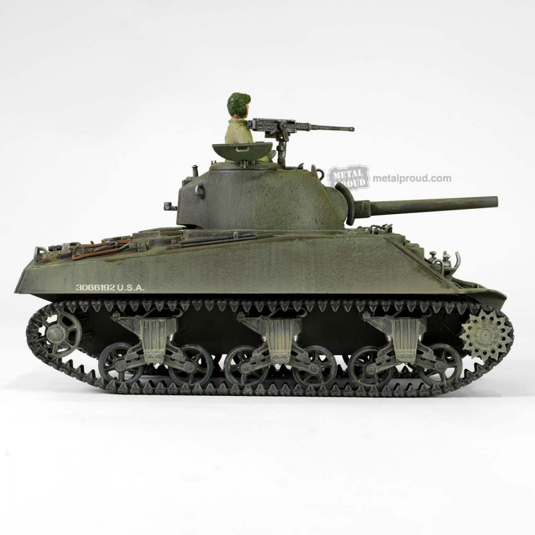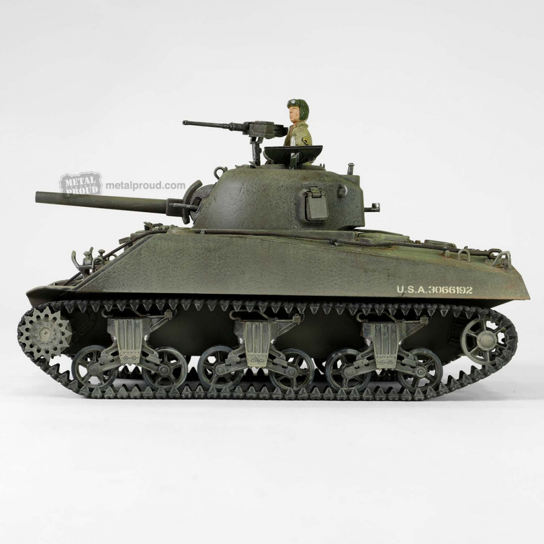 Bardzo ładnie wykonany metalowy model amerykańskiego czołgu Sherman M4(75) z II wojny światowej. Model oferuje szereg wyszukanych detali, w tym szczegółową komorę silnika i jednostkę napędową lub oddzielny model jednostki napędowej. Obrotowa wieża działowa, ruchoma lufa armaty i ruchomy karabin maszynowy. Dostarczany z autentyczną podstawką, akcesoriami i realistyczną figurką dowódcy czołgu, zobacz galerię zdjęć.