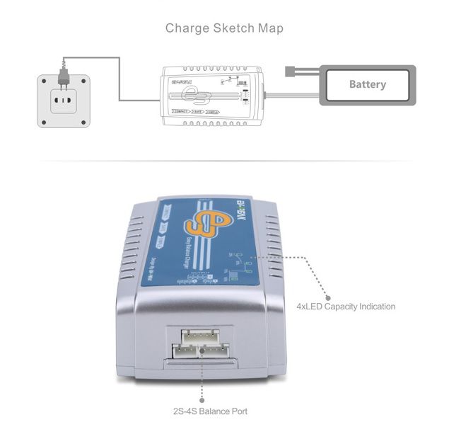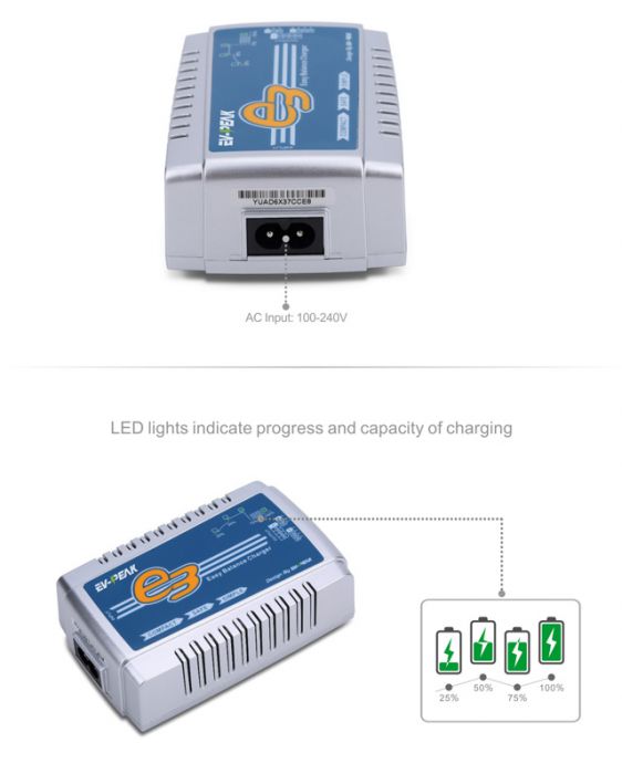 Kompaktowa ładowarka EV-PEAK e3 przeznaczona jest wyłącznie do ładowania akumulatorów LiPo . Moc ładowania: 35W, prąd ładowania: 3A.