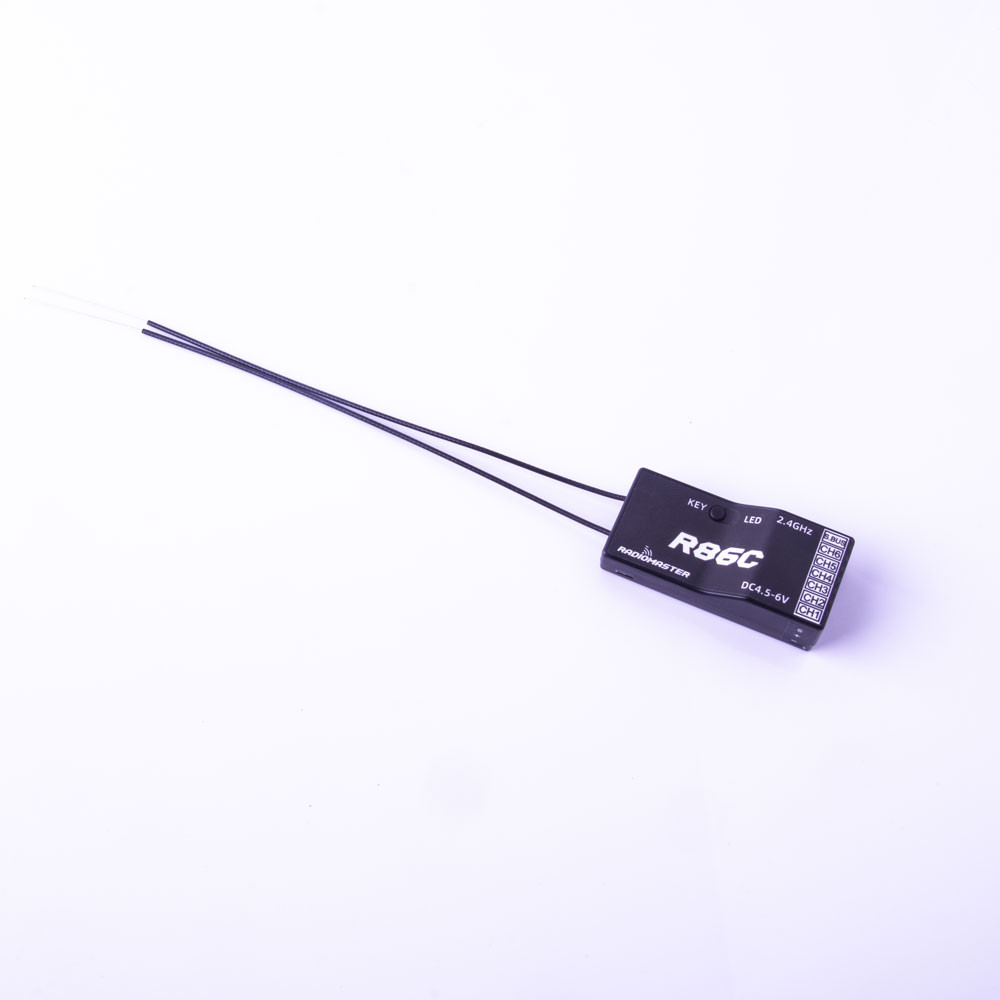 RadioMaster R86C FrSky D8 Compatible PWM/SBUS přijímač. Tento telemetrický přijímač je vybaven 6 porty pro připojení běžných serv PWM a 1 portem S.BUS, ke kterému lze připojit až 8 kanálů. 9. kanál je vyhrazen pro přenos RSSI. Napájecí napětí: 4,5–8,4 V, rozměry: 45×21×12,7 mm, hmotnost: 8 g. Přijímač disponuje 2 anténami o délce cca 150 mm.