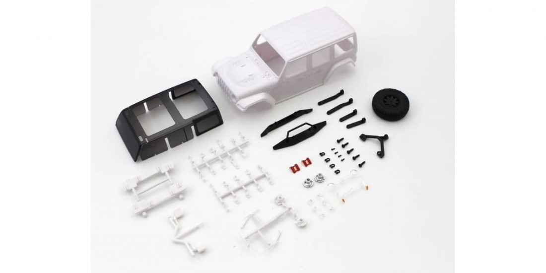 Niepomalowane nadwozie do modelu RC Jeep Wrangler Rubicon z serii Mini-Z 4×4. W skład zestawu wchodzą zderzaki przedni i tylny, koło zapasowe, elementy mocujące i inne akcesoria.