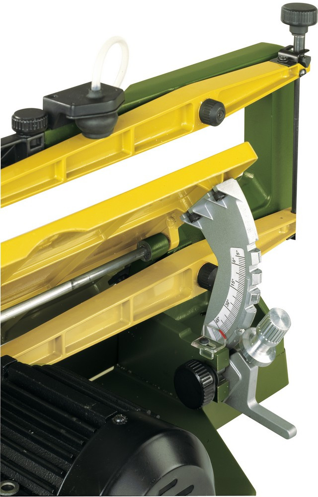 Opatentowane ogniwa zaciskowe zapewniające dobre mocowanie brzeszczotu bez użycia kołków. Wycięcia w stole roboczym służą do umieszczania prowadnic i regulacji długości brzeszczotu piły. Stół można pochylić w zakresie od -5° do 50°. Skale: 0°, 10°, 20°, 30° i 45°. Dodatkowa precyzyjna regulacja do cięć ukośnych i kątowych.