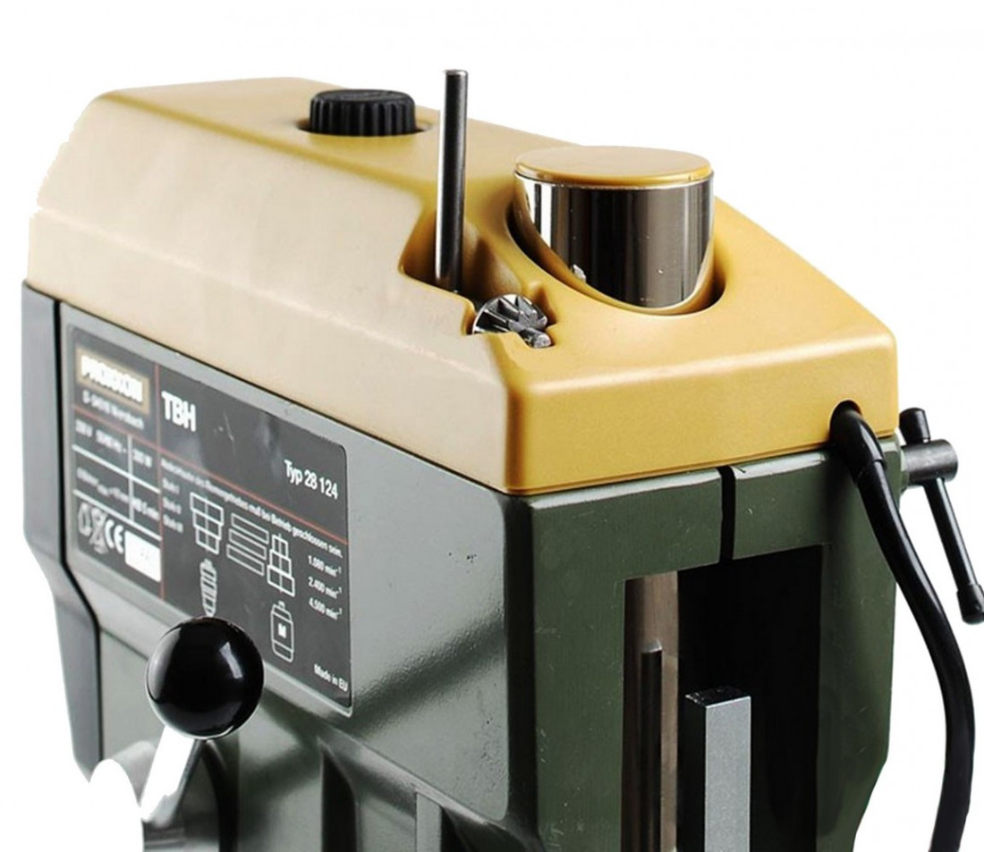 Mocny silnik o długiej żywotności. Napęd wrzeciona poprzez potrójne koło pasowe z paskiem wielorowkowym i 6-krotnie większy moment obrotowy w zakresie niższych prędkości. Praktyczny wskaźnik głębokości wiercenia z regulowanym ogranicznikiem. Precyzyjnie pozycjonowane wrzeciono wiertarskie. Głowica wrzeciona z gwintem 1/2" do uchwytu wiertarskiego należącego do urządzenia (jakość przemysłowa), a także do stosowania tulei zaciskowych, które można znaleźć pod numerem katalogowym 28200.