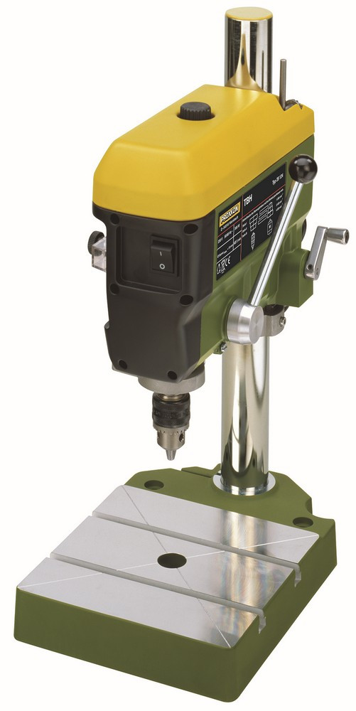 Stół i korpus wiertarki stołowej wykonane są z odlewu aluminiowego. Materiał szlachetny, odporny na rdzę i trwały. Łożyska i prowadnice frezujemy na najnowocześniejszych maszynach CNC. Stabilny, mocno żebrowany, płasko frezowany stół roboczy z rowkami teowymi. Praktyczna regulacja wysokości maszyny nad podstawą za pomocą korby i listwy zębatej.