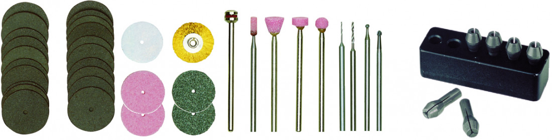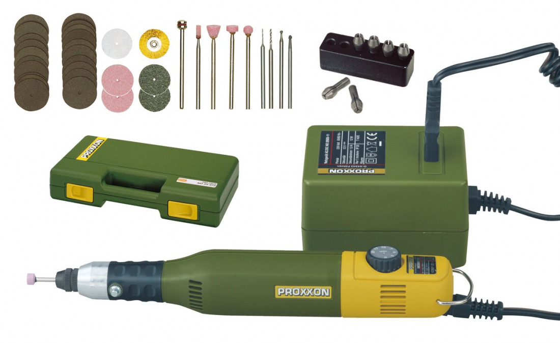 Model szlifierki i wiertarki zasilany jest prądem o napięciu 220 - 240 V (12 V, 1,0 A). W zestawie znajdują się również 34 narzędzia montażowe o jakości przemysłowej: 1 ostrzałka diamentowa, 1 precyzyjny frez, jedno mikrowiertło o ø 0,5 i 1,0 mm, 1 szczotka mosiężna, 4 precyzyjne ostrzałki korundowe (cylindryczna, kulkowa, tarczowa i stożkowa), 1 brzeszczot, 2 tarcze szlifierskie o ø 22 x 3 mm każda z węglika krzemu i drobnego korundu, 20 tarcz tnących, 1 trzpień mocujący, 6 tulei zaciskowych od 1,0 do 3,2 mm.