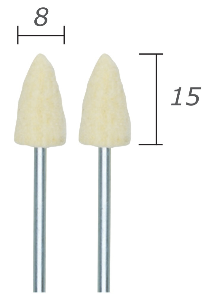 Filcowe podkładki i tarcze polerskie. Aby uzyskać wysoki połysk na metalach, złocie, srebrze, metalach nieżelaznych, mosiądzu i aluminium, należy użyć pasty polerskiej. Nadaje się również do prac wykończeniowych przy produkcji narzędzi i form. Zalecana niska prędkość zapobiega przypalaniu się obrabianego przedmiotu i uszkodzeniu narzędzia. Utwardzoną pastę można zmiękczyć olejem lub poprzez delikatne podgrzanie. Średnica trzonka 2,35 mm.