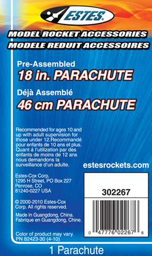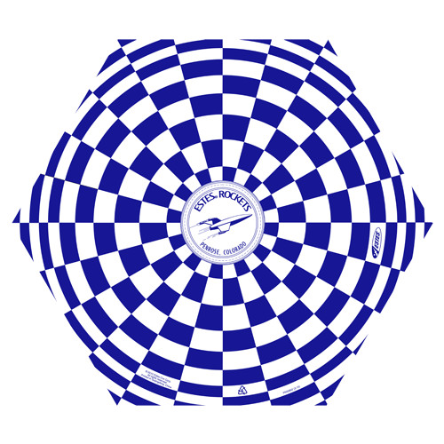 Spadochron Estes do rakiet wykonany jest z PVC. Spadochrony mają barwę niebiesko-białą, średnicę 46 cm, są w całości przystosowane do modelu rakiety, udźwig 150 - 250 g.