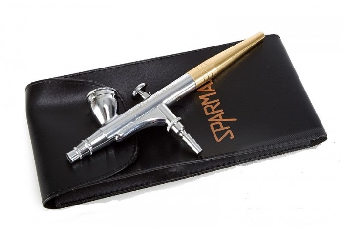 Součástí setu je dvoučinná pistole HB-040 (balení obsahuje adaptér pro přestavbu na jednočinnou), kompresor DC-25, síťový adaptér a příslušenství pro připojení.