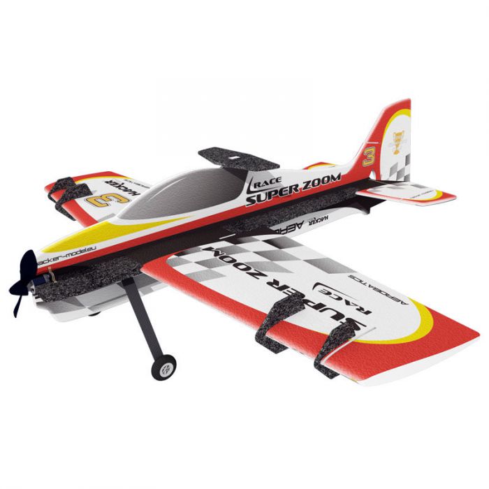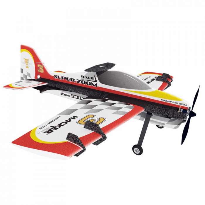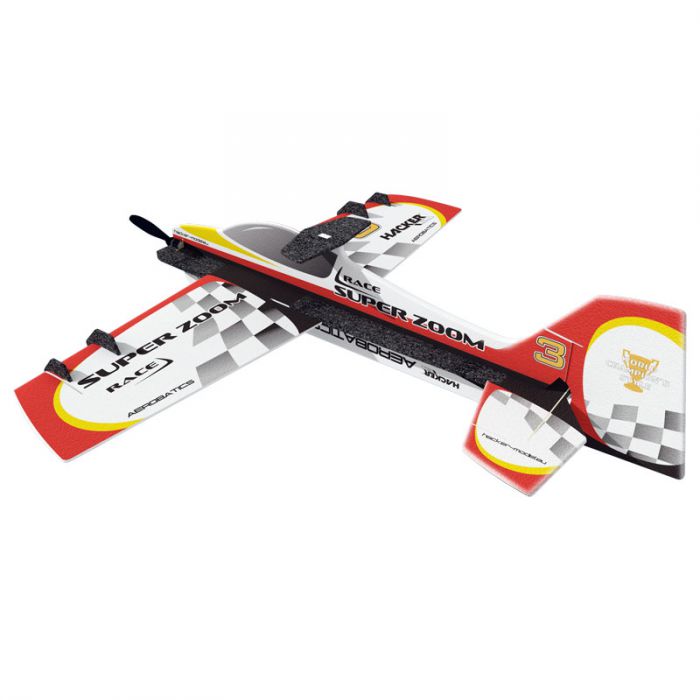 Popularny model akrobacyjny w nowej wersji, w atrakcyjnych wariantach kolorystycznych, z większą powierzchnią skrzydeł, większą powierzchnią boczną kadłuba i generatorami siły nośnej bocznej (SFG). Koncepcja „shock”, skrzydło o symetrycznym profilu i ogólna geometria modelu czynią z Super Zooma Race potężny model do wykonywania ekstremalnych akrobacji lotniczych. Główne elementy modelu wykonane są z polipropylenu spienionego (EPP), co zapewnia doskonałą wytrzymałość modelu zarówno w locie, jak i w przypadku drobnych zderzeń. Model wyposażono w podwozie wykonane z włókna węglowego i szklanego.